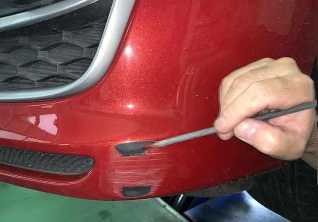 駐車や幅寄せの時にできてしまった、バンパーの角の擦りキズ修理。小さなキズはもちろん、大きな擦りキズも板金塗装でキレイに直すことができますので、ご相談ください。
