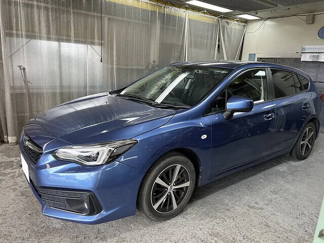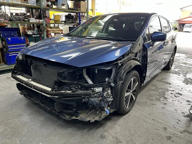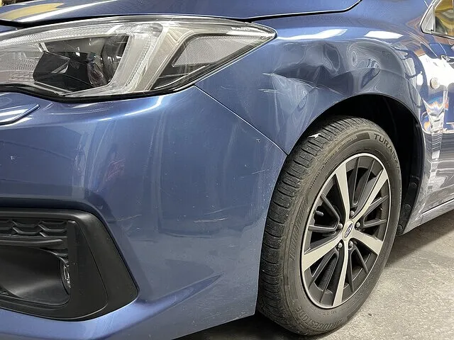 スバル インプレッサスポーツのフロントフェンダー・フロントバンパーのキズ・へこみ修理(板金塗装)が完了しました。