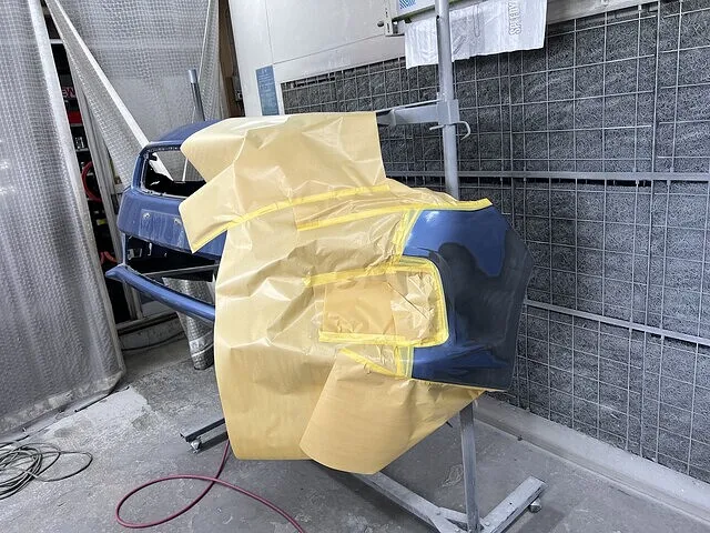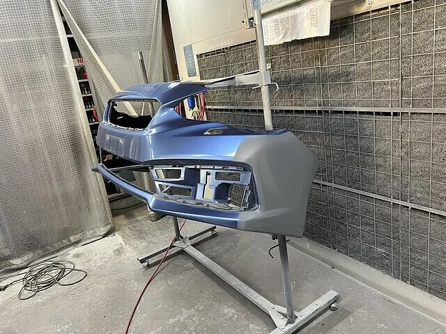 フロントフェンダー・フロントバンパーのキズ・へこみを板金塗装で修理していきます。