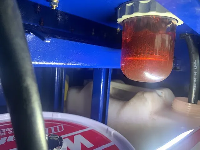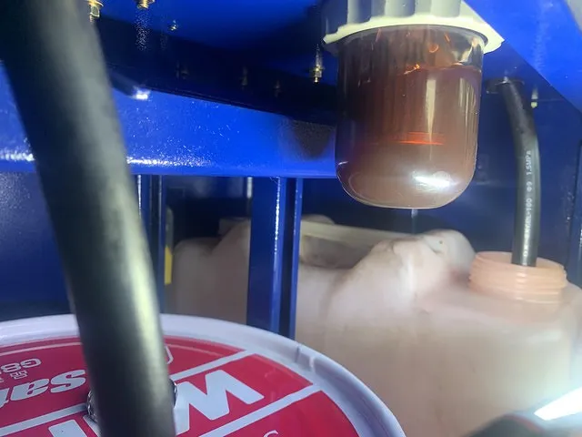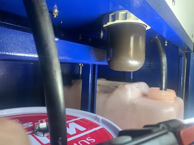 ストレーナーも外し磁石も綺麗に清掃します。清掃が完了したら、オイルパンを元通りに組み付けて、いよいよ圧送交換を開始!