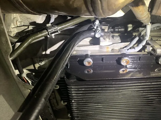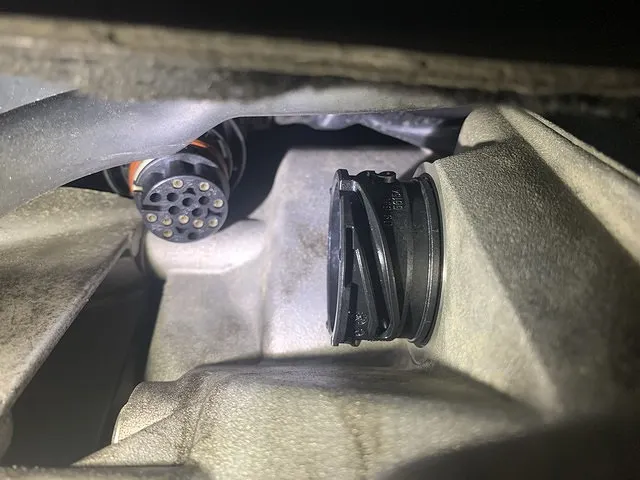 オイルパンを元通りに組み付けて、いよいよ圧送交換です。専用アタッチメントがないと圧送交換ができませんが、当店ではアタッチメントも取り寄せることが可能なため問題ありません。下の左側の画像のコネクタスリーブも一緒に交換します。