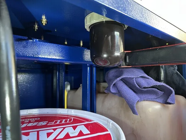 ストレーナーも交換してオイルパンを元通りに組み付けて、いよいよ圧送交換です。